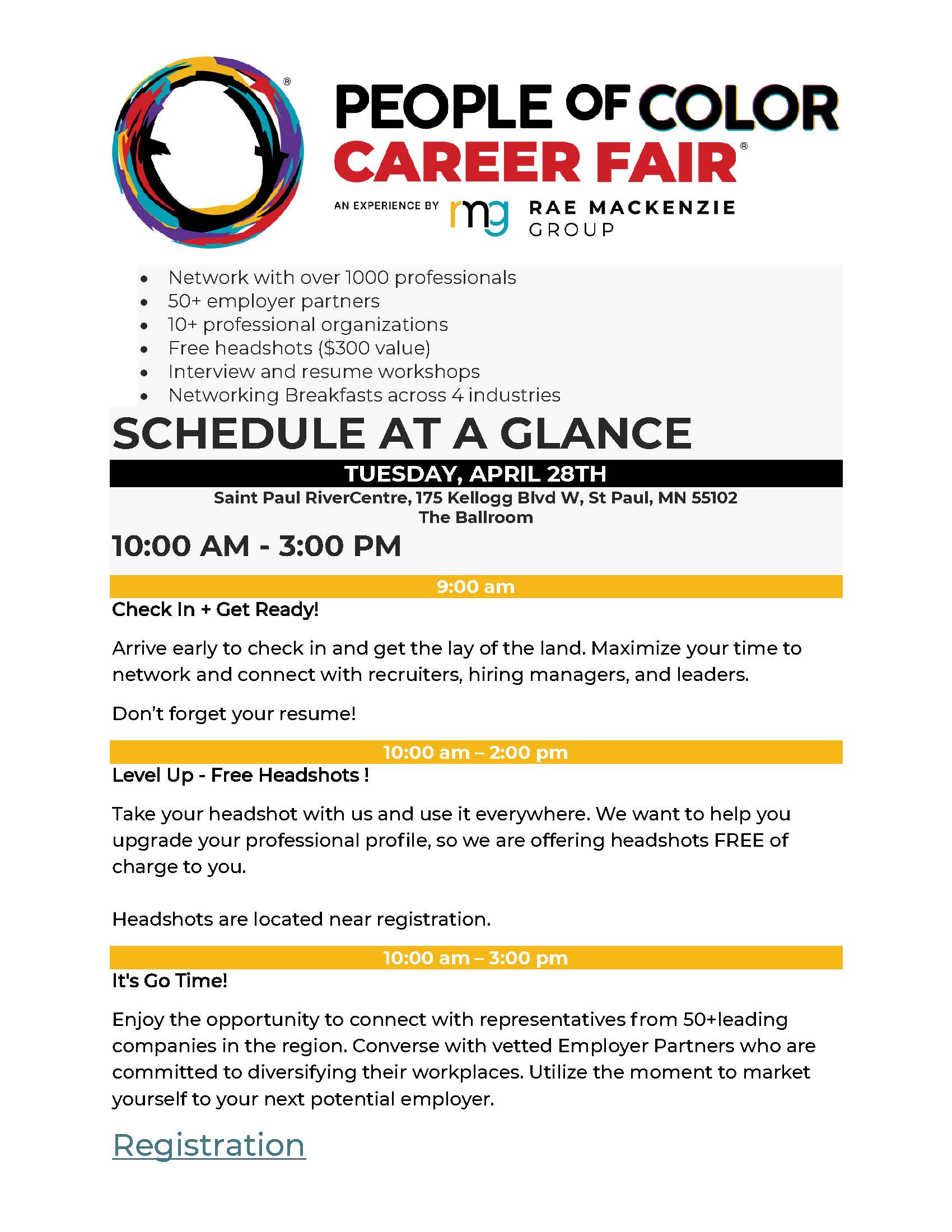 Saint Paul RiverCentre 175 Kellogg Blvd West, St Paul, MN, MN, United StatesNetwork with over 1000 professionals, 50+ employer partners, 10+ professional organizations, Free headshots ($300 value), Interview and resume workshops, and…