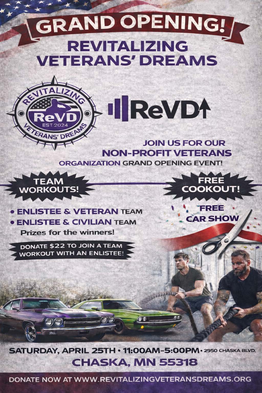 Revitalizing Veterans' Dreams 2950 Chaska Blvd, Chaska, MN, United StatesThe event will include a Team Workout at noon ($22 to participate in the workout) and a Free Car…