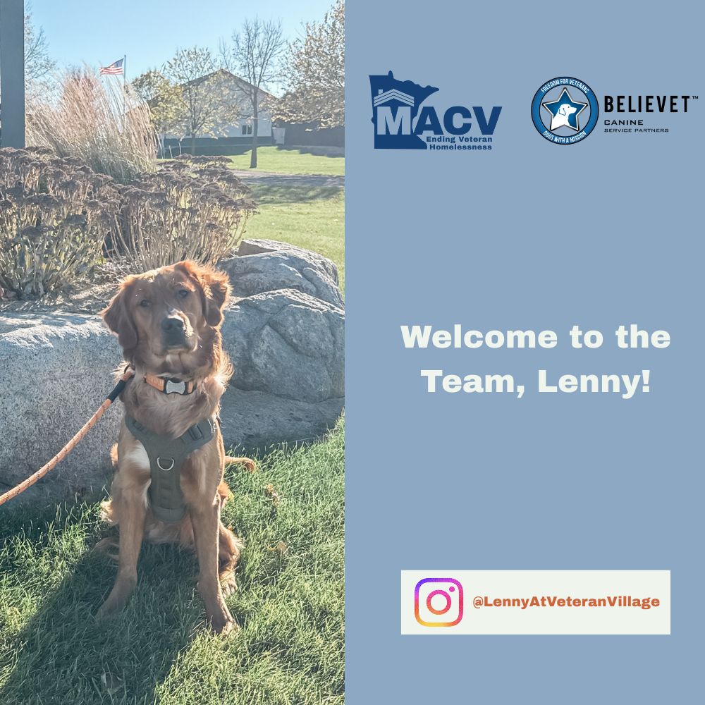 He’s one year old, full of heart, and currently training with Believet Canine Service Partners, a Minnesota-based nonprofit responsible for preparing him to become the Facility Dog for MACV’s Veteran Village in Eagan. Believet’s mission is to provide service dogs for American military Veterans living with PTSD, TBI, and other disabilities. Their dogs are an essential part of a Veteran’s healing journey — offering unconditional support in difficult moments and helping restore independence, dignity, and connection.